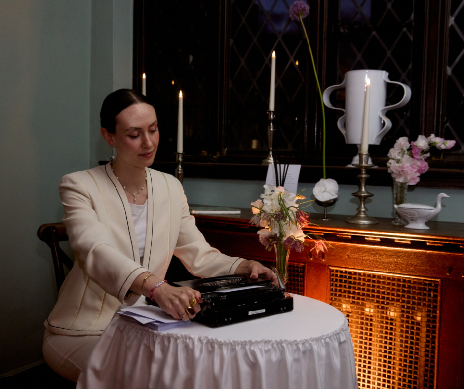 Guests approach as they wish, and I invite them to share a topic - or I offer a thoughtful, tailored question. After a brief exchange, I compose a bespoke poem on my vintage typewriter in about a minute, and present it as a gift.