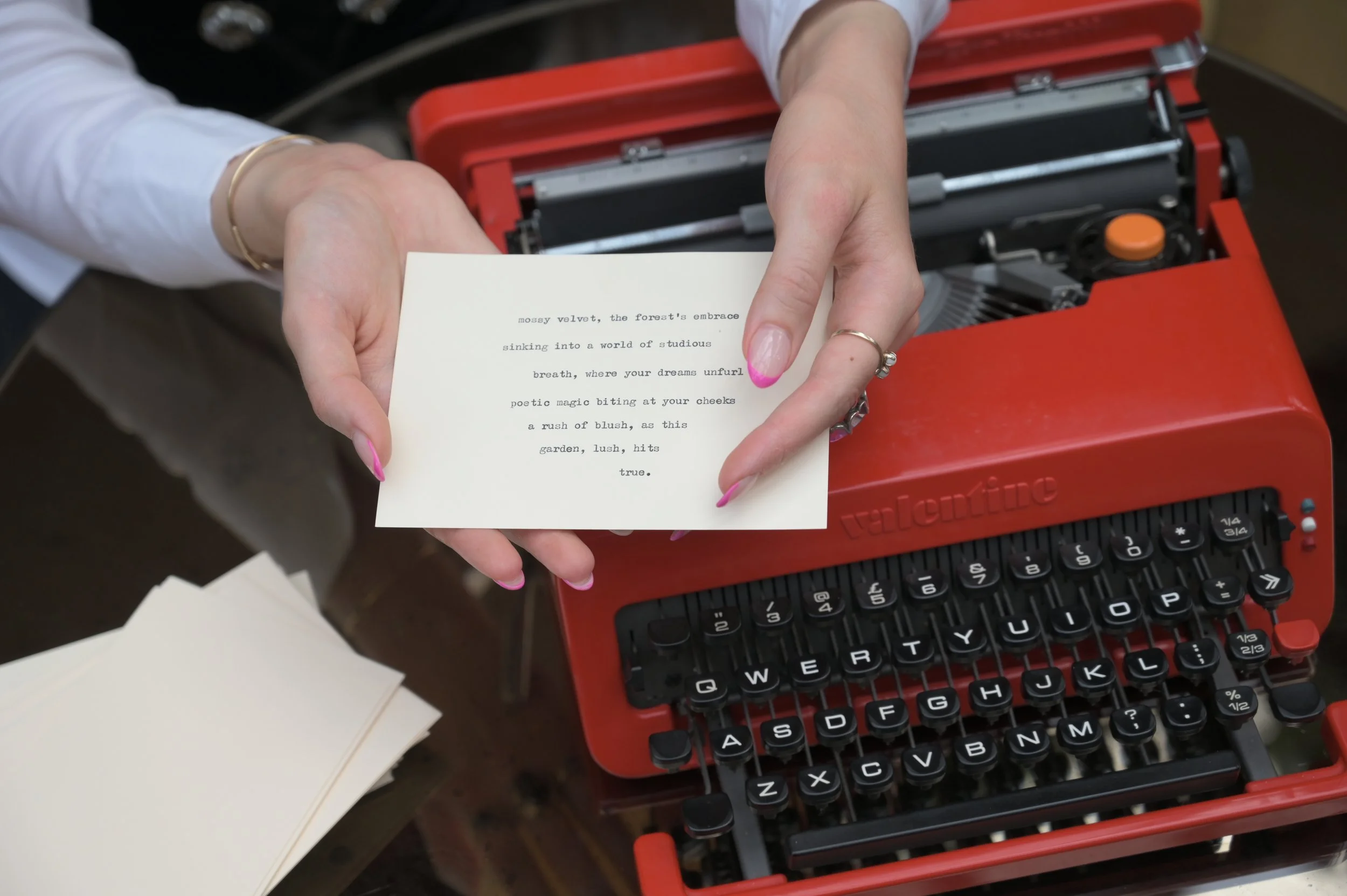 A vintage orange typwriter on a wooden table, surrounded by white and red flower bouquets, perfume bottles, a small notebook, and various bottles, with a sheer curtain in the background.